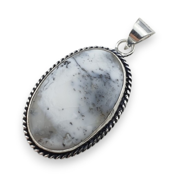Dendritic agate is a variety of agate distinguished by delicate inclusions resembling branches, leaves, or moss. These natural patterns are formed by the presence of manganese and iron oxides. The stone symbolizes harmony with nature, growth, and tranquility, and in jewelry it is valued for its unique, picturesque designs.