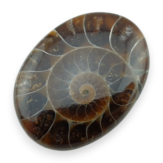 Amonit kaboszon - naturalna skamieniałość. Amonit to skamieniała muszla prehistorycznych głowonogów o charakterystycznym, spiralnym kształcie. Dzięki naturalnemu pochodzeniu i unikatowemu rysunkowi jest chętnie wykorzystywany w biżuterii i projektach dekoracyjnych. (Dokładny rozmiar sprawdź w opisie na dole strony).