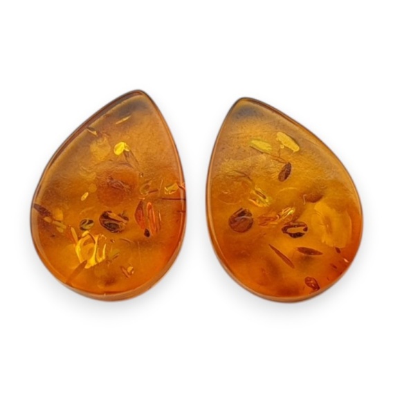 Bursztyn bałtycki płaska łezka para naturalna. Para bursztynu bałtyckiego na kolczyki o ciepłej barwie i ciekawych inkuzjach. Zdjęcia prezentują konkretną oferowaną parę kupując otrzymasz dokładnie ten zestaw.