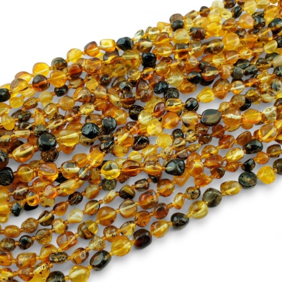 Baltic amber - a bead in the form of small, irregular, polished stones, approximately 6-9 mm in size. Natural amber from the Baltic Sea is strung on a 60 cm long cord with a screw clasp. The product can be worn as a finished necklace or used to create jewelry - bracelets, earrings, and amber necklaces. Each cord is unique and randomly selected.