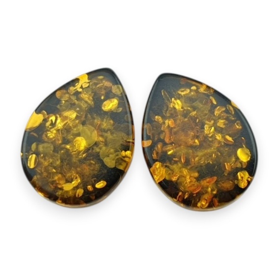 Baltic amber earring pairs are made from natural fossilized resin with a warm hue and unique inclusions. They are lightweight, elegant, and perfect for creating timeless, classic jewelry.