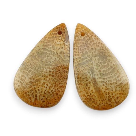 Fossil para kaboszonów z dziurką - kamień naturalny. Para naturalnych kaboszonów dopasowanych kolorostycznie i wymiarowo. Kamienie posiadają otwory montażowe do łatwego stworzenia kolczyków. Zdjęcia prezentują konkretny oferowany kamień, kupując otrzymasz dokładnie ten egzemplarz. (Dokładny rozmiar sprawdź w opisie na dole strony).