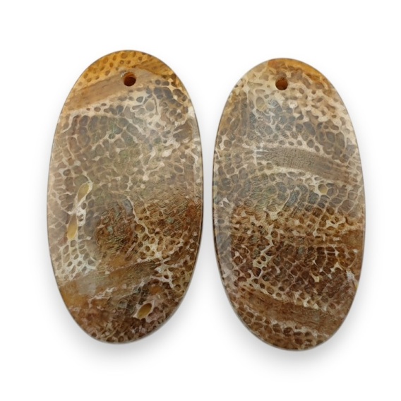 Fossil para kaboszonów z dziurką - kamień naturalny. Para naturalnych kaboszonów dopasowanych kolorostycznie i wymiarowo. Kamienie posiadają otwory montażowe do łatwego stworzenia kolczyków. Zdjęcia prezentują konkretny oferowany kamień, kupując otrzymasz dokładnie ten egzemplarz. (Dokładny rozmiar sprawdź w opisie na dole strony).