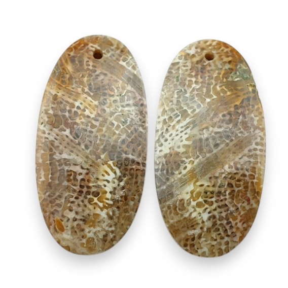 Fossil para kaboszonów z dziurką - kamień naturalny. Para naturalnych kaboszonów dopasowanych kolorostycznie i wymiarowo. Kamienie posiadają otwory montażowe do łatwego stworzenia kolczyków. Zdjęcia prezentują konkretny oferowany kamień, kupując otrzymasz dokładnie ten egzemplarz. UWAGA na spodzie widoczne ślady markera. (Dokładny rozmiar sprawdź w opisie na dole strony).