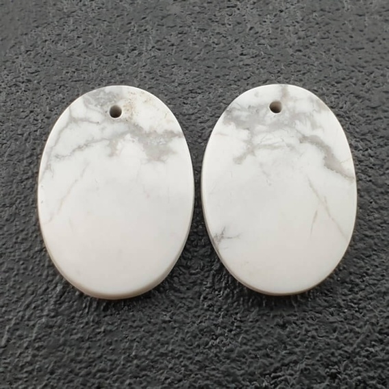 Howlit para kaboszonów z dziurką - kamień naturalny. Para naturalnych kaboszonów dopasowanych kolorostycznie i wymiarowo. Kamienie posiadają otwory montażowe do łatwego stworzenia kolczyków. Zdjęcia prezentują konkretny oferowany kamień, kupując otrzymasz dokładnie ten egzemplarz. UWAGA na tyle kamieni widoczne ślady markera. (Dokładny rozmiar sprawdź w opisie na dole strony).