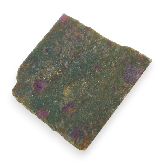Ruby in fuchsite cut raw - natural stone. A raw mineral cut into slices is a natural stone divided into thin, decorative sections that reveal its colors and characteristic veining. It serves as a striking material for jewelry, ornaments, and collectible pieces. Photos show a specific stone available in the offer, when you buy you will receive this cabochon. (For exact dimensions, see description below).