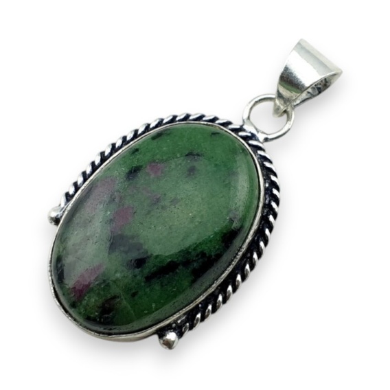 Rubin w zoisycie zawieszka - gotowa zawieszka z kamieniem w okuciu w kolorze srebrnym. Ręcznie robiony wisior z kamieniem naturalnym do stworzenia naszyjnika. Zdjęcia przedstawiają konkretny wisior dostępny w ofercie, kupując otrzymasz właśnie ten egzemplarz. (Dokładne wymiary można znaleźć w opisie poniżej).