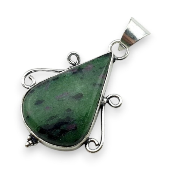Rubin w zoisycie zawieszka - gotowa zawieszka z kamieniem w okuciu w kolorze srebrnym. Ręcznie robiony wisior z kamieniem naturalnym do stworzenia naszyjnika. Zdjęcia przedstawiają konkretny wisior dostępny w ofercie, kupując otrzymasz właśnie ten egzemplarz. (Dokładne wymiary można znaleźć w opisie poniżej).