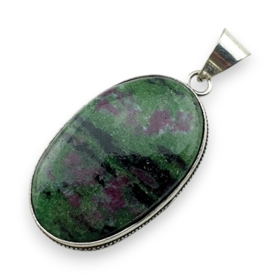 Rubin w zoisycie zawieszka - gotowa zawieszka z kamieniem w okuciu w kolorze srebrnym. Ręcznie robiony wisior z kamieniem naturalnym do stworzenia naszyjnika. Zdjęcia przedstawiają konkretny wisior dostępny w ofercie, kupując otrzymasz właśnie ten egzemplarz. (Dokładne wymiary można znaleźć w opisie poniżej).
