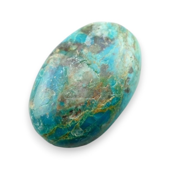 Szatukit kaboszon - kamień naturalny szlifowany na kształt kaboszonu. Szatukit to unikalny minerał miedziowy, który wyróżnia się niezwykłymi odcieniami niebieskiego i zielonego. Jego wyjątkowy wygląd oraz rzadkość sprawiają, że jest idealnym wyborem do tworzenia biżuterii oraz kolekcjonerskich ozdób. Zdjęcia przedstawiają konkretny kamień dostępny w ofercie, kupując otrzymasz właśnie ten kaboszon. (Dokładne wymiary można znaleźć w opisie poniżej).