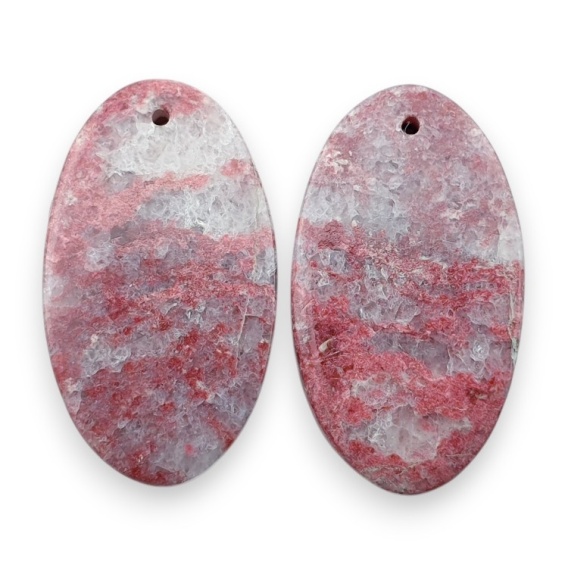 Thulit para kaboszonów z dziurką - kamień naturalny. Para naturalnych kaboszonów dopasowanych kolorostycznie i wymiarowo. Kamienie posiadają otwory montażowe do łatwego stworzenia kolczyków. Zdjęcia prezentują konkretny oferowany kamień, kupując otrzymasz dokładnie ten egzemplarz. (Dokładny rozmiar sprawdź w opisie na dole strony).