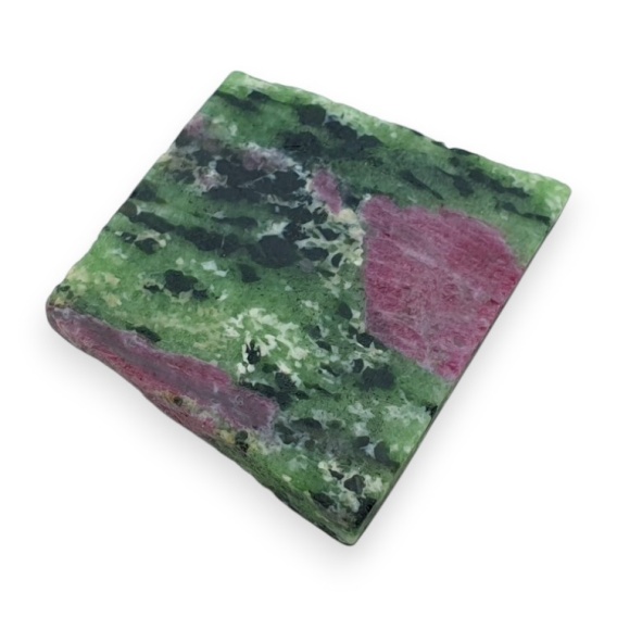 Zoisyt z rubinem cięty surowy - kamień naturalny. Surowy minerał cięty na plastry to naturalny kamień podzielony na cienkie, dekoracyjne fragmenty odsłaniające jego barwy i charakterystyczne żyłkowania. Stanowi efektowny materiał do biżuterii, ozdób i elementów kolekcjonerskich. (Dokładny rozmiar sprawdź w opisie na dole strony).